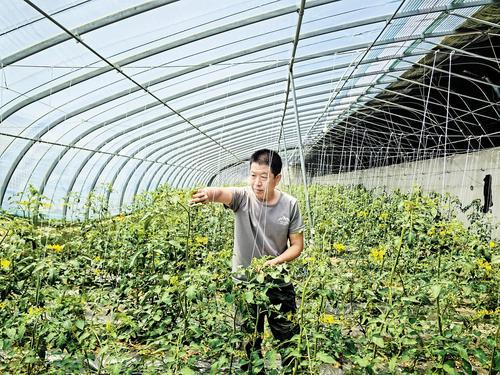 5月16日,青龍河村種植戶郭保軍的大棚內(nèi),西紅柿藤蔓上頂著黃色的小花,一顆顆小西紅柿點綴其間。郭保軍忙著為西紅柿藤蔓打尖,西紅柿的長勢讓他非常滿意。