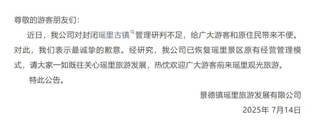 在村民的反對(duì)和輿論關(guān)注下,7月14日,江西省景德鎮(zhèn)市瑤里景區(qū)發(fā)布公告稱,近日,我公司對(duì)封閉瑤里古鎮(zhèn)管理研判不足,給廣大游客和原住民帶來(lái)不便。對(duì)此,我們表示最誠(chéng)摯的歉意。經(jīng)研究,我公司已恢復(fù)瑤里景區(qū)原有經(jīng)營(yíng)管理模式,請(qǐng)大家一如既往關(guān)心瑤里旅游發(fā)展,熱忱歡迎廣大游客前來(lái)瑤里觀光旅游。