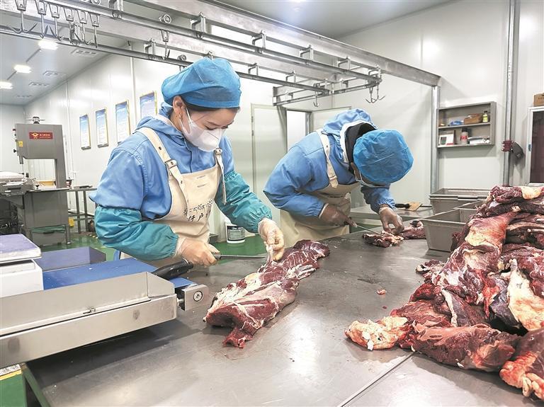 “一只成年藏羊在經(jīng)過檢疫達標屠宰后,先送至排酸間用保鮮排酸技術進行排酸,再被送進這里分割加工、剔骨、修割?!鼻獞裟翀黾庸ぼ囬g工作人員馬玉梅介紹說。只見她手持專用刀具,沿著羊肉的肌肉紋理精準下刀,將藏羊按部位分割成精品羊肋排、羊腿肉(帶骨)、羊脖片等不同區(qū)塊。隨后,新鮮的藏羊肉被快速分揀至不同區(qū)域,有的進入真空包裝機完成封裝,有的則被送往進一步加工的流水線。車間里機器運轉(zhuǎn)的低鳴聲與工作人員專注的動作交織,每一個環(huán)節(jié)都嚴格遵循衛(wèi)生標準,確保肉類從分割到成品的全程安全。