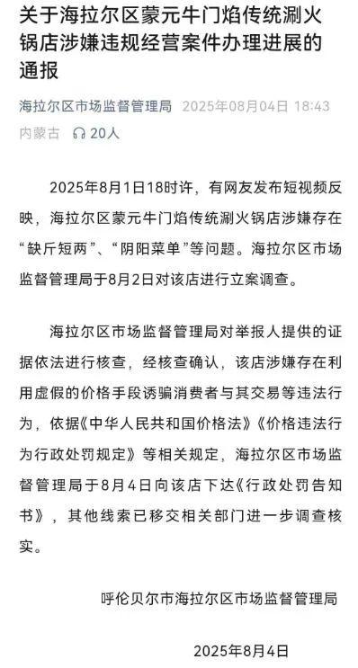 8月2日,海拉爾區(qū)市場(chǎng)監(jiān)管局也展開(kāi)立案調(diào)查。最新通報(bào)顯示,8月4日,內(nèi)蒙古呼倫貝爾市海拉爾區(qū)市場(chǎng)監(jiān)督管理局針對(duì)涉事火鍋店涉嫌違規(guī)經(jīng)營(yíng)一案向該店下達(dá)了《行政處罰告知書(shū)》。