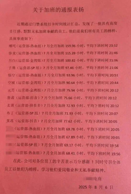 近日,某網(wǎng)友在社交平臺貼出了一則某電商公司《關于加班的通報表揚》。表揚信中顯示,有員工7月份加班159.96小時,平均下班時間為23點12分。