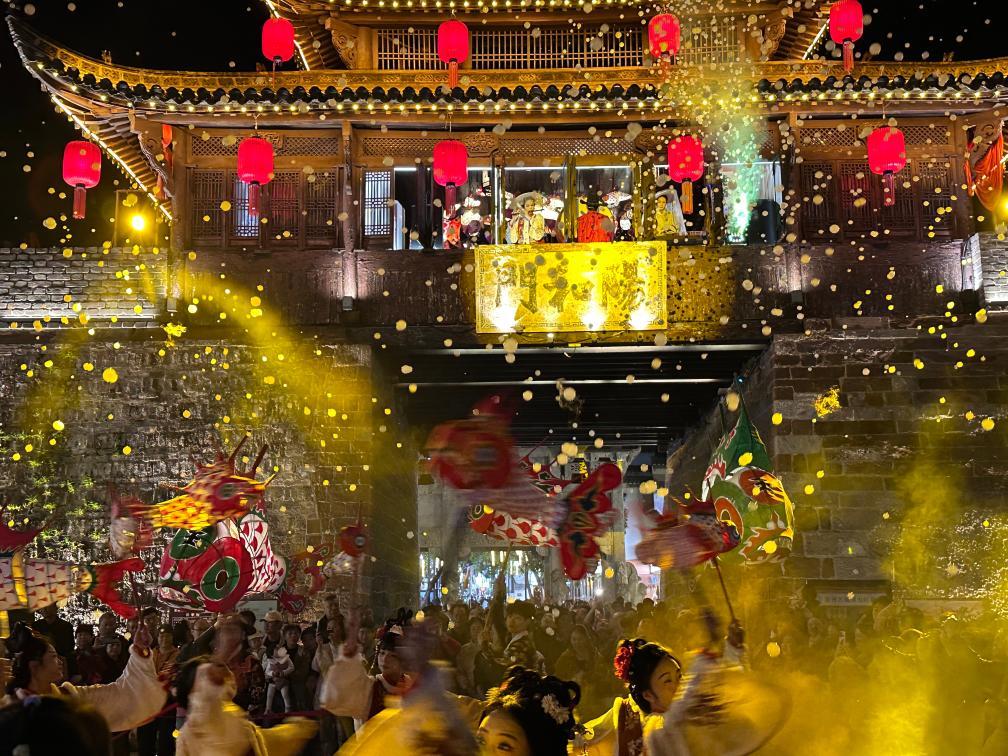 夜色漸濃,安徽歙縣徽州古城陽和門上鼓聲乍起,一盞盞流光溢彩的魚燈應(yīng)聲游走,穿梭于黛瓦飛檐間。光影搖曳中,詩人筆下“鳳簫聲動(dòng),玉壺光轉(zhuǎn),一夜魚龍舞”的盛景在徽州大地復(fù)現(xiàn)。