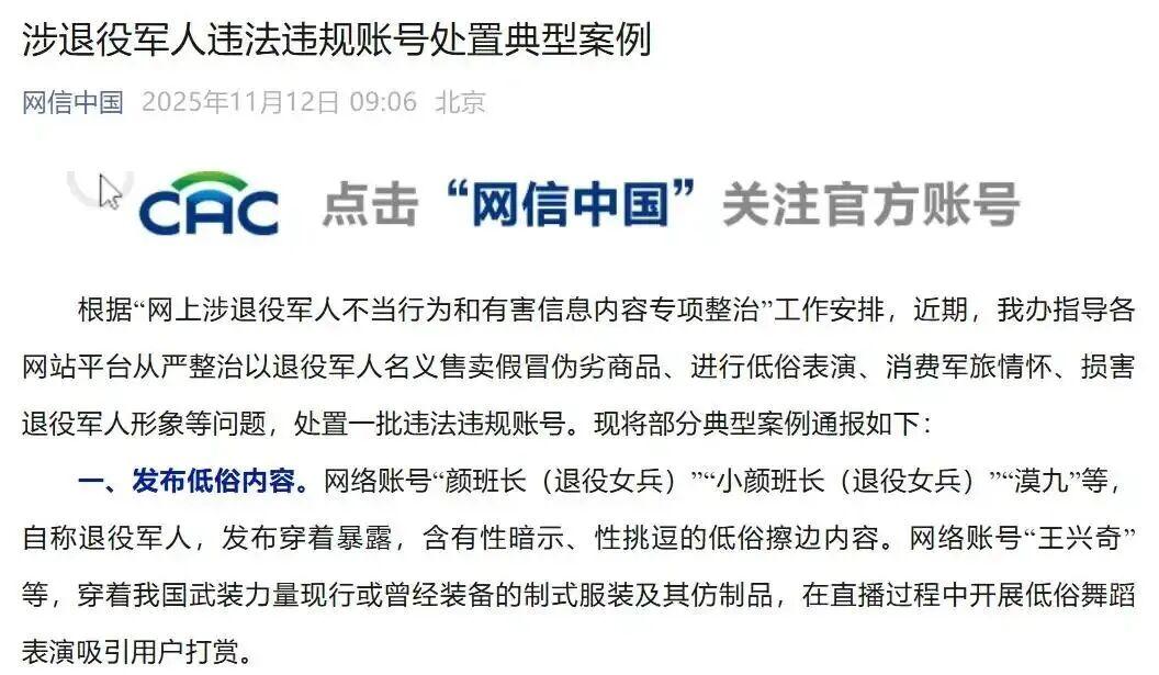 日前,中央網(wǎng)信辦通報(bào)一批涉退役軍人違法違規(guī)賬號(hào)處置典型案例,“顏班長(zhǎng)(退役女兵)”“宋班長(zhǎng)(正能量)”等一批以退役軍人名義售賣假冒偽劣商品、進(jìn)行低俗表演、傳播虛假信息等損害軍人軍隊(duì)形象的違法違規(guī)賬號(hào)被依法查處。