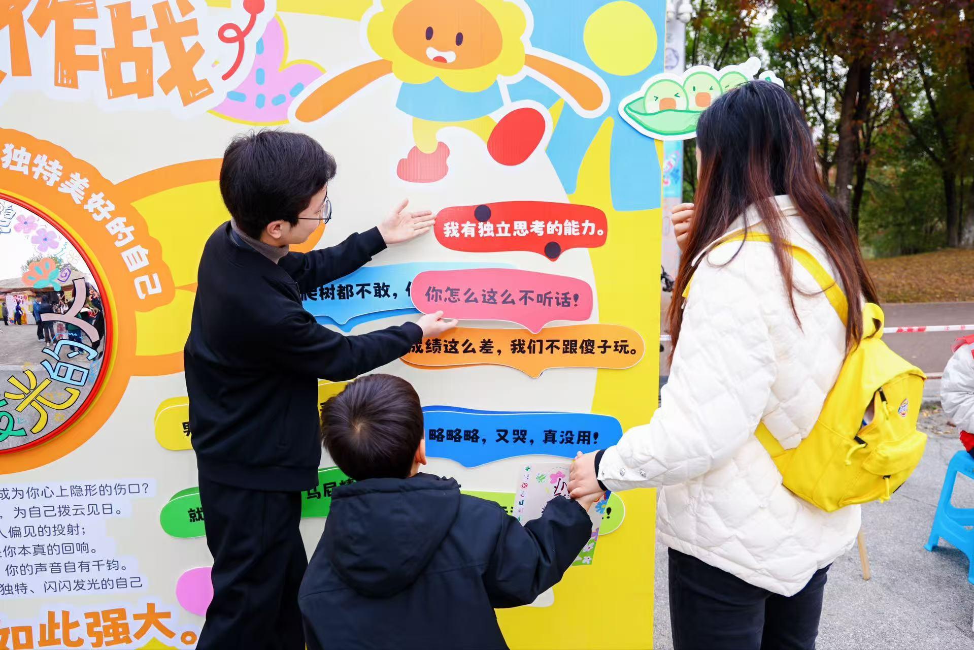 “愛的加油站”具象地展示了對抗暴力最柔軟的方式是愛。在“夸夸挑戰(zhàn)區(qū)”,不管是親子、情侶還是朋友,大家面對面真誠贊美、溫暖擁抱。直接的情感流動(dòng),讓每個(gè)人都感受到了人際關(guān)系中的安全感與支持力。