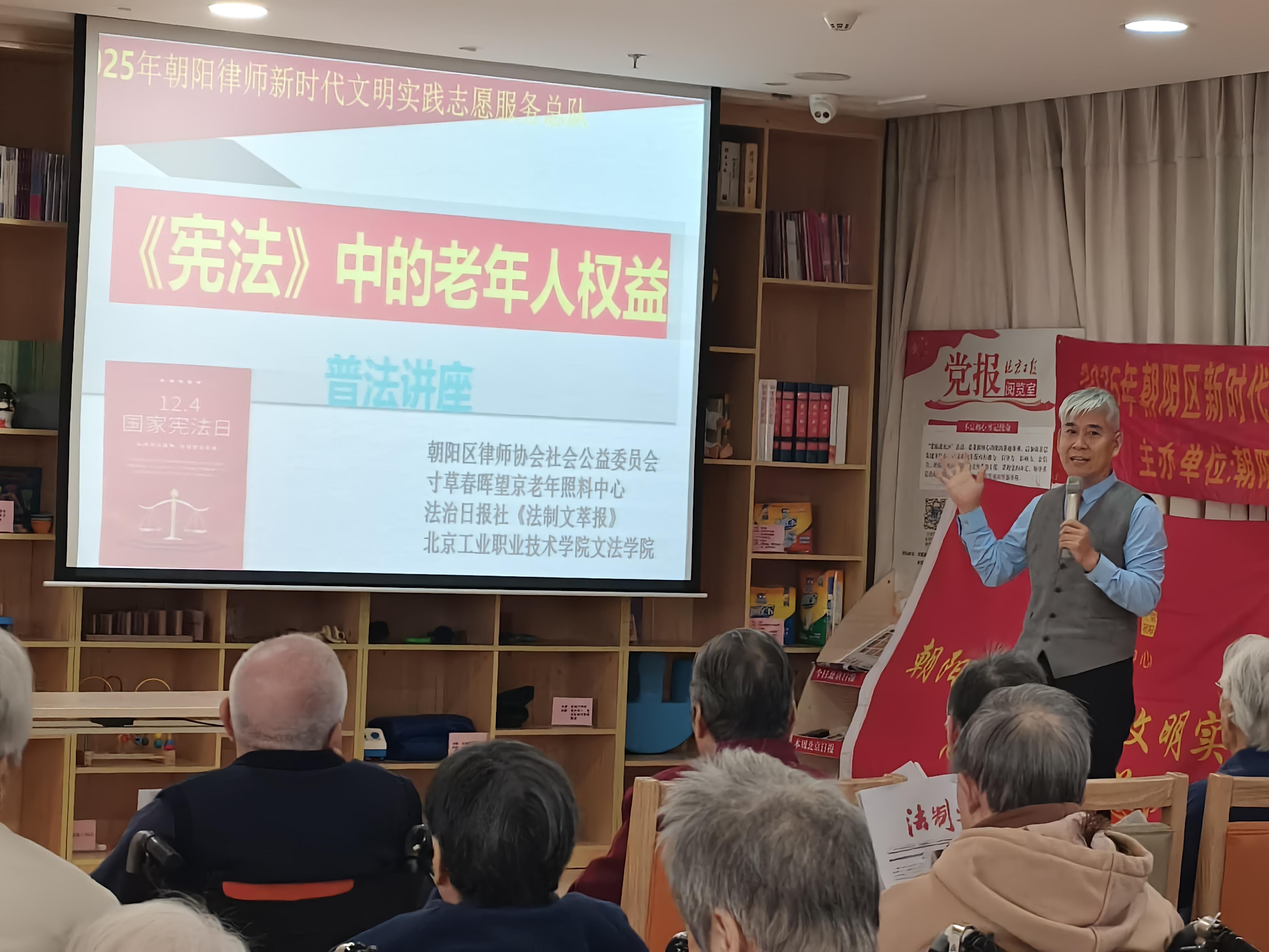 12月4日,在第十二個(gè)國家憲法日當(dāng)天,法治日報(bào)社《法制文萃報(bào)》攜手北京市朝陽區(qū)律師協(xié)會公益與社會責(zé)任委員會律師團(tuán)、北京工業(yè)職業(yè)技術(shù)學(xué)院文法與管理學(xué)院師生,走進(jìn)寸草春暉望京老年公寓,以“弘揚(yáng)憲法精神,維護(hù)老年人權(quán)益”為主題開展公益普法活動,旨在讓法治服務(wù)觸手可及,讓憲法精神浸潤老年生活。