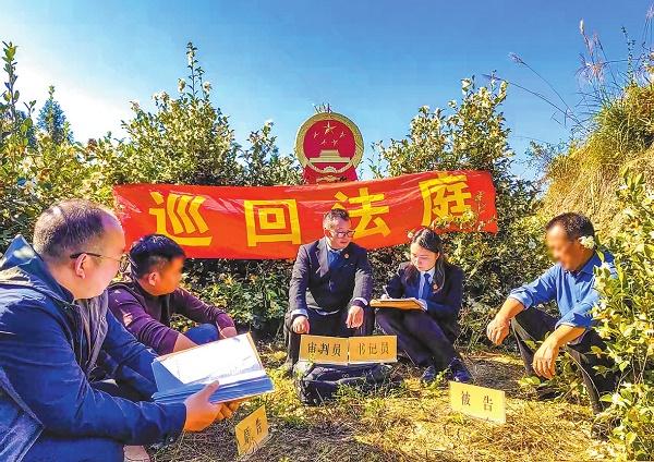 圖為重慶市酉陽(yáng)土家族苗族自治縣人民法院酉酬人民法庭庭長(zhǎng)陳長(zhǎng)周在油茶林里現(xiàn)場(chǎng)開(kāi)庭審理合同糾紛。資料圖片