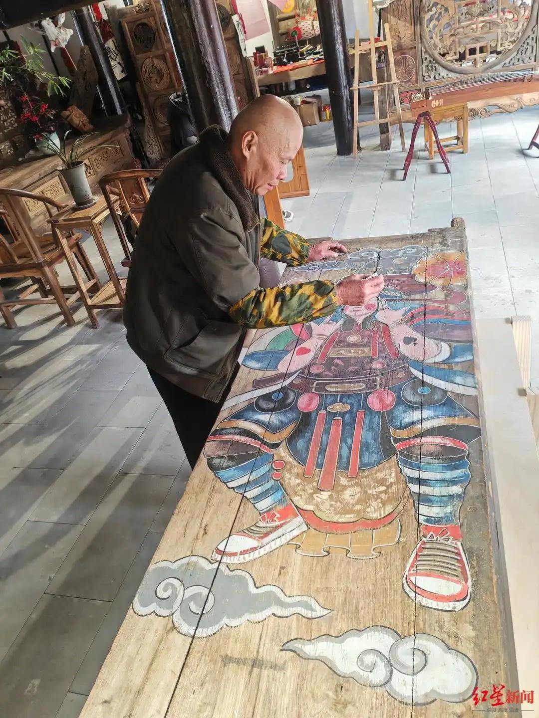 2月10日上午,“萬千氣象看四川”大型主題采訪活動走進四川南充市閬中古城,在古城北街的門神畫展示中心,省級非物質文化遺產(chǎn)“閬中門神畫”傳承人張桅正在店里一塊木門板上創(chuàng)作門神畫。不同于很多地方是貼門神畫,閬中的門神是直接“畫”到大門上去的,色澤古樸,栩栩如生。