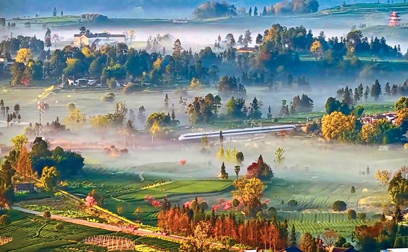 近日,一段拍攝于四川省雅安市名山區(qū)的茶園航拍視頻火爆全網(wǎng),更登上央視新聞、人民日報等多家中央級媒體平臺,讓名山的春日茶景驚艷全國。畫面里,朝霞映照茶山,晨霧繚繞在層層疊疊的茶壟間,一列動車如銀龍穿梭其間,車影與薄霧相融,金黃晨光與翠綠茶田相映,遠(yuǎn)處村落若隱若現(xiàn),宛若現(xiàn)實(shí)版《千里江山圖》,被網(wǎng)友盛贊“每一幀都是壁紙”。