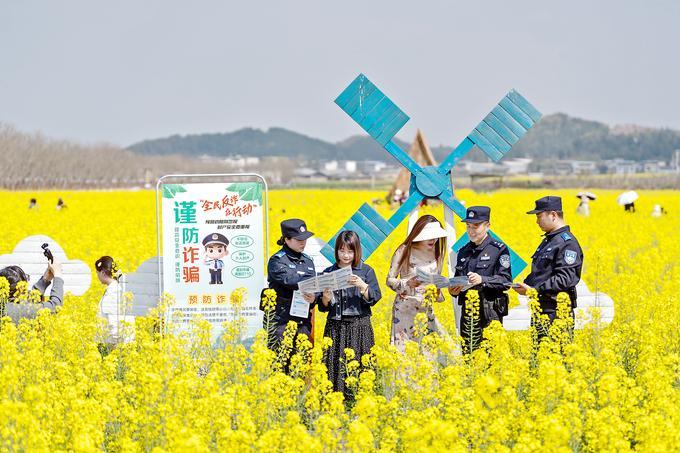 暖風(fēng)和煦,金波蕩漾。近日,四川省綿陽市涪城區(qū)楊家鎮(zhèn)的千畝油菜花迎來盛放期,宛如金色海洋,吸引無數(shù)市民游客奔赴這場春日之約。在如畫美景中,一抹抹流動的“藏藍(lán)”成為獨特而安心的風(fēng)景——綿陽市公安局涪城區(qū)分局的民警輔警,將反詐宣傳的“課堂”搬到了田間地頭,讓平安守護(hù)與盎然春意相伴相融。