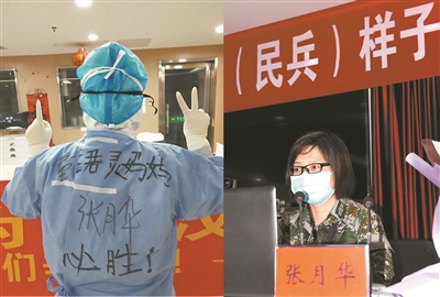 圖為張月華身著防護(hù)服在抗疫一線支援。右圖為張月華正在人武部做報告。周曉明 攝