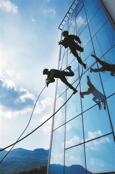 圖為開展高樓索降突擊訓練。
