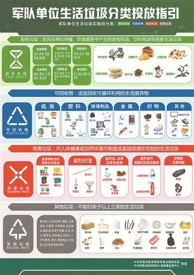 2017年,《關于軍隊單位落實生活垃圾分類制度的意見》印發(fā)。明確對于駐地已實施強制分類制度的軍隊單位,要積極主動配合當?shù)赜嘘P部門,堅決落實生活垃圾強制分類制度和駐地有關要求,積極做好營區(qū)生活垃圾分類工作。對于駐地尚未實施生活垃圾強制分類制度的軍隊團以上機關、院校、科研和醫(yī)療單位,要率先開展生活垃圾強制分類工作;其他單位應當按照要求,以及駐地人民政府制定的生活垃圾分類指南,自覺穩(wěn)步地開展生活垃圾分類。2019年,在北京地區(qū)組織開展5個生活垃圾分類示范營區(qū)建設。