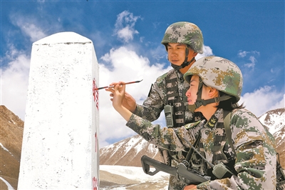 1號(hào)界碑位于雪山達(dá)坂上,道路崎嶇,常年積雪。巡邏隊(duì)伍經(jīng)過(guò)4個(gè)多小時(shí)的艱難跋涉,終于到達(dá)。站在界碑旁,官兵們面向國(guó)旗莊嚴(yán)宣誓:“我們一定會(huì)守好祖國(guó)的每一寸土地!”