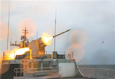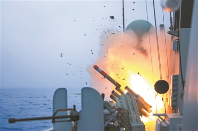 “開火!”指揮員下達作戰(zhàn)命令。黃石艦上,防空導彈拖著紅色尾焰呼嘯而出,直撲“敵”機。信陽艦上,主炮噴吐烈焰,對“敵”艦實施有效火力打擊……