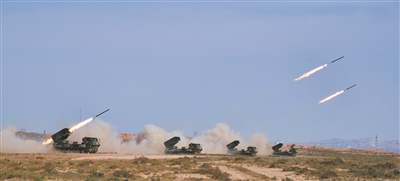 炮火封鎖、空中偵察……“敵”情接踵而至,紅方裝甲兵、炮兵、工兵等多兵種密切協(xié)同,迅速占領(lǐng)有利打擊陣位?!叭B射擊,101號目標(biāo)火力點(diǎn)……”紅方指揮員一聲令下,某自行火箭炮炮手快速校對標(biāo)尺、高低和方向,精準(zhǔn)鎖定“敵”目標(biāo)。炮聲響起,一枚枚火箭彈射向目標(biāo),一時間,戈壁深處烽煙四起。