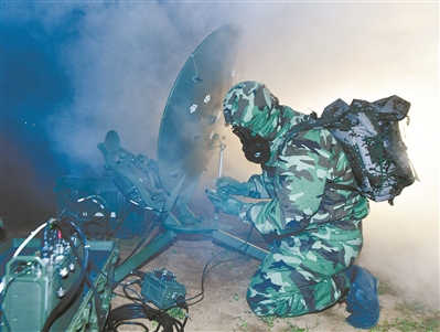 “前方有情況,全身防護快速通過!”接到命令,參訓人員迅速掏出隨身攜帶的防毒面具和防護服,在規(guī)定時間內(nèi)完成防護,并準確判定風向,以特定隊形快速通過。