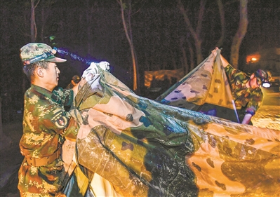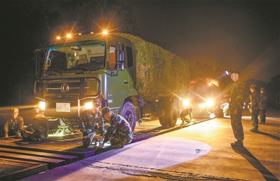 測量邊距、打入鐵釘、捆綁加固……鐵路裝載現(xiàn)場,官兵僅憑汽車近光燈和手電照明,熟練地進行分組作業(yè)。除了器械碰撞聲,很少聽到其他聲音,全程一氣呵成、干凈利落。