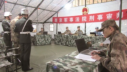 風(fēng)雨中,戰(zhàn)時自傷案件的軍事刑事審判正在野戰(zhàn)帳篷中緊張進(jìn)行,控辯雙方激烈交鋒。突然,一陣空襲警報響起,戰(zhàn)時審判庭馬上臨時休庭,全體人員緊急疏散隱蔽。