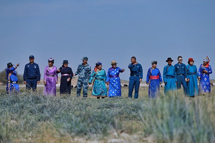 圖為官兵和牧民在草原感受飛播帶來的改變。