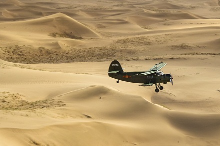 圖為官兵駕駛運-5飛機飛越西北戈壁執(zhí)行飛播造林任務(wù)。劉暢 攝