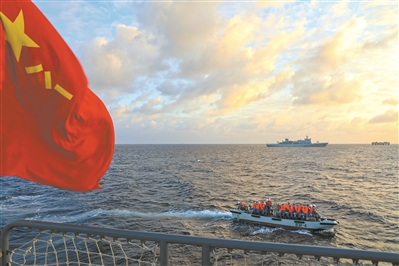 醫(yī)療船派出小艇靠近島礁,接官兵上船就診。