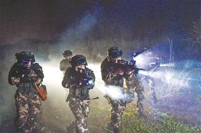 “注意!”行動中,一名隊員險些觸碰到“暴恐分子”設(shè)置的爆炸物。官兵迅速處置險情,并與“暴恐分子”展開周旋。夜幕降臨后,趁“暴恐分子”精神松懈之際,指揮員果斷下達突擊命令,官兵以迅雷之勢成功制“敵”并解救“人質(zhì)”。