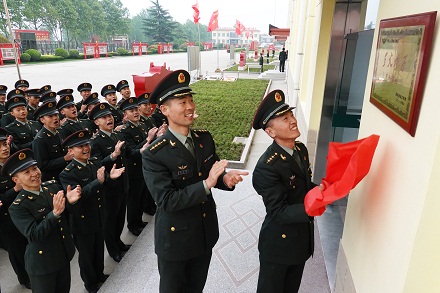 第83集團(tuán)軍某旅“紅一連”官兵在連隊(duì)門前懸掛“星火燎原”育人基地牌匾。張永進(jìn) 攝