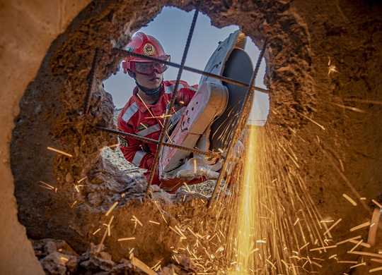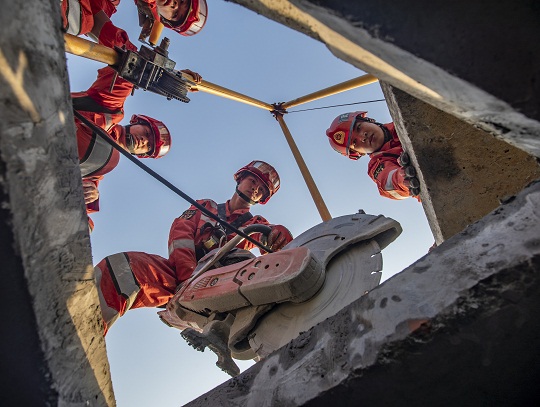 圖為官兵利用內(nèi)燃無(wú)齒鋸進(jìn)行快速破拆。