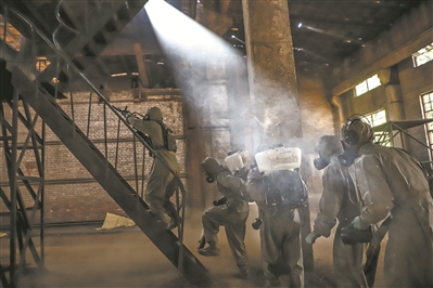 “3名‘暴恐分子’藏匿于化工廠(chǎng)二樓!”晨曦微露,偵察隊(duì)員段鳳喬一邊報(bào)告?zhèn)刹烨闆r,一邊掩護(hù)防化分隊(duì)?wèi)?zhàn)友對(duì)廠(chǎng)區(qū)泄漏化學(xué)物質(zhì)進(jìn)行處理。