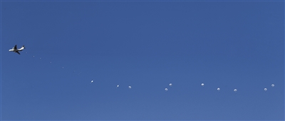 7時(shí)10分,飛機(jī)抵達(dá)預(yù)定空域?!半x機(jī)準(zhǔn)備,跳!”隨著投放員下達(dá)口令,官兵們魚貫而出。轉(zhuǎn)瞬之間,朵朵傘花在高空競相綻放。安全著陸后,特戰(zhàn)隊(duì)員迅速集結(jié),按照預(yù)定編組向“敵”前沿隱蔽突防。