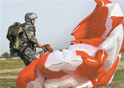 特戰(zhàn)隊(duì)員精準(zhǔn)著陸后快速收傘。
