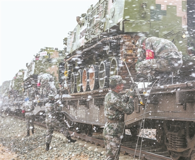 千里機動至演練地域后,官兵頂風冒雪卸載車輛裝備。