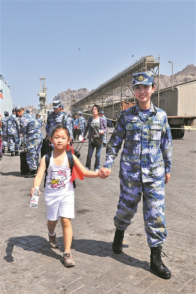 2015年也門撤僑行動中,郭燕手牽一個(gè)小朋友上艦回家。熊利兵 攝