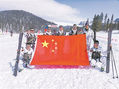 2021年4月,滕家?。ê笈庞胰﹨⒓印皣H軍事比賽-2021”雪地作戰(zhàn)行軍項(xiàng)目比賽時(shí),與戰(zhàn)友合影。楊再新 攝