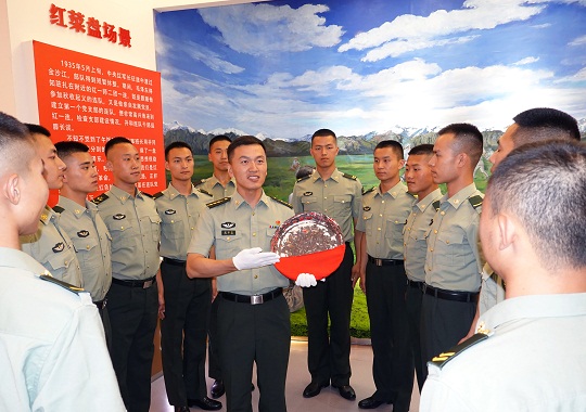 圖為“紅一連”指導(dǎo)員鄭紀(jì)文為戰(zhàn)士們講解連隊(duì)“紅菜盤”的故事。張永進(jìn) 攝