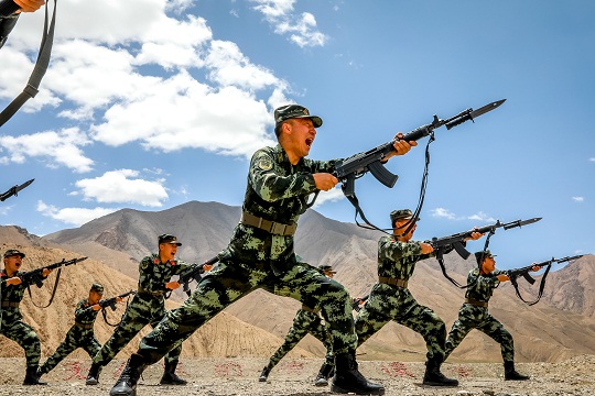 圖為楊富祥(前一)帶領(lǐng)戰(zhàn)士在昆侖山隧道沿線巡邏。楊浩 攝