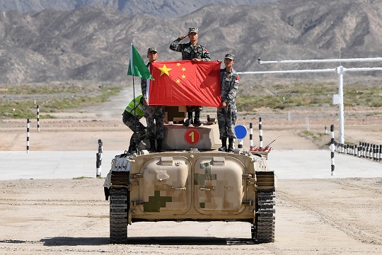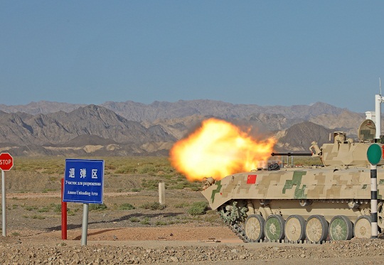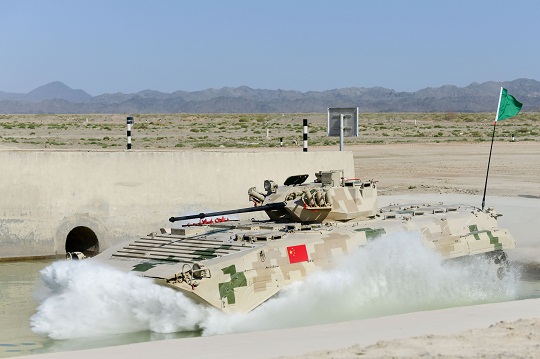 圖為中國參賽隊員駕駛步戰(zhàn)車駛?cè)肷嫠畧?。王?攝