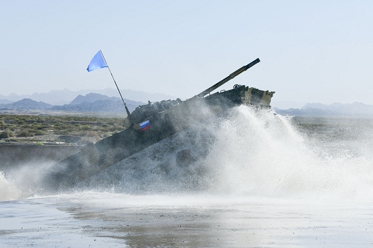 中國車組快速通過機動越障路段后,漂移進(jìn)入射擊陣位,三名參賽隊員領(lǐng)彈、裝彈一氣呵成,隨著“砰砰”聲響,遠(yuǎn)方5個隨機顯示的靶標(biāo)應(yīng)聲而倒。白俄羅斯車組第四個出場,駛出射擊陣位,戰(zhàn)車一路飛馳,快速轉(zhuǎn)彎后,加速沖入涉水場,激起數(shù)米高的水花。