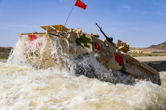 圖為中國參賽車組通過涉水場。姜東坡 攝