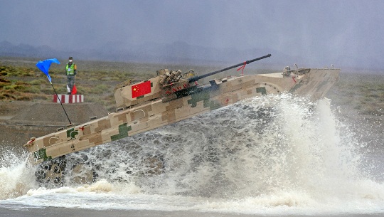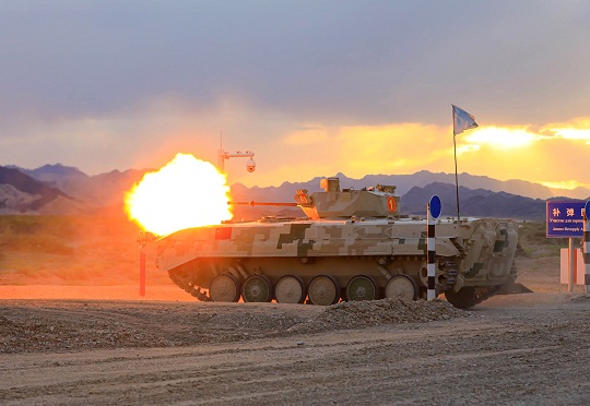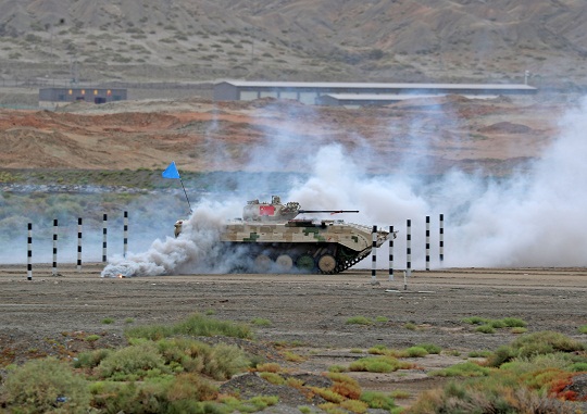 圖為中國參賽隊駕駛步戰(zhàn)車通過煙火路段。羅興倉 攝
