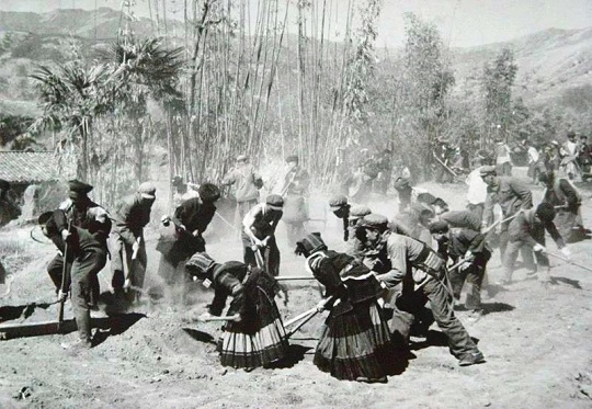 圖為創(chuàng)業(yè)初期,彝漢群眾與航天工作者合力建設。