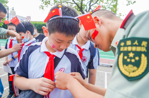 圖為武警戰(zhàn)士給學生貼上國旗貼紙,佩戴活動胸標。