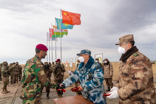 圖為閉幕式上,外國將軍為表現(xiàn)優(yōu)異的中國軍人授勛。司磊 攝