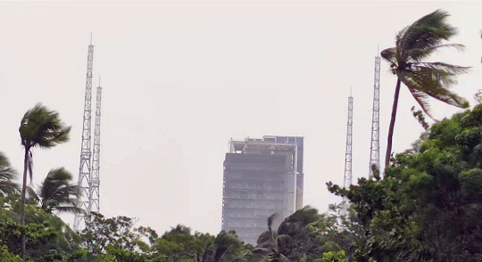 據(jù)悉,早在臺風(fēng)“獅子山”來臨前,發(fā)射場科技人員就開展專題討論,制定應(yīng)急預(yù)案,組織各系統(tǒng)崗位落實(shí)設(shè)備設(shè)施防臺風(fēng)措施,對室外設(shè)備進(jìn)行加固,加班加點(diǎn),提前完成了發(fā)射塔架回轉(zhuǎn)平臺打開、長征七號活動平臺進(jìn)入垂直總裝測試廠房避風(fēng)等大項(xiàng)工作,有效保證了臺風(fēng)期間發(fā)射塔架和活動平臺的安全。