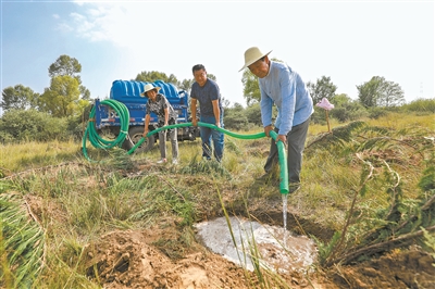 張連?。ㄓ乙唬┡c老伴王秀蘭、兒子張曉斌一起為樹苗澆水。