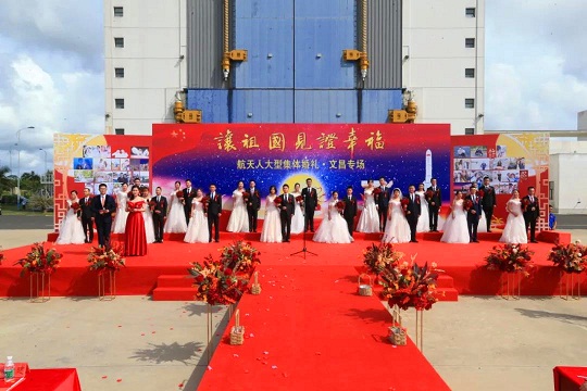 2020年10月1日,當(dāng)中秋遇上國慶,中心在西昌和文昌發(fā)射場,為52對航天新人同步舉行“讓祖國見證幸?!奔w婚禮。