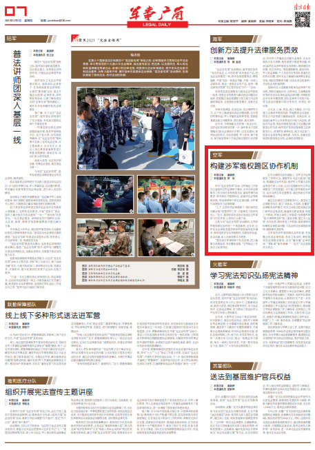 在充分調(diào)研論證的基礎(chǔ)上,空軍召開法律服務(wù)工作研討會(huì),著眼軍隊(duì)司法行政部門建設(shè)、構(gòu)建跨區(qū)協(xié)作機(jī)制、維護(hù)軍人軍屬合法權(quán)益等進(jìn)行深入交流,出臺(tái)《加強(qiáng)新時(shí)代空軍法律服務(wù)工作的措施》,分片建立涉軍維權(quán)協(xié)作區(qū),由官兵所在單位提需求,就近指派空軍律師協(xié)助解決。