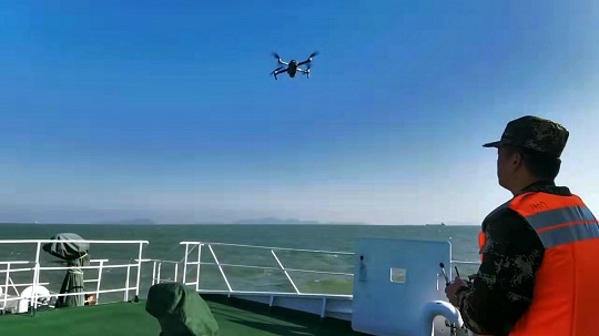 圖為海警執(zhí)法人員正在操縱無人機(jī)。