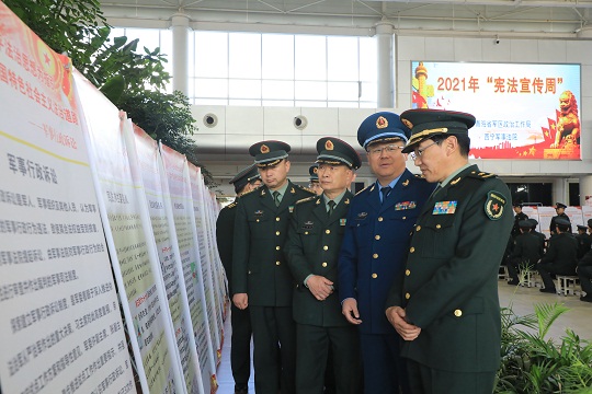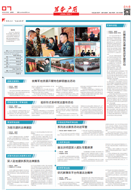 “在全面依法治軍、全面從嚴(yán)治軍新的征程上,只有將憲法至上的理念銘刻于心、外化于行,才能不斷激發(fā)官兵弘揚(yáng)憲法精神,貫徹依法治軍、從嚴(yán)治軍。”西部戰(zhàn)區(qū)第二軍事法院領(lǐng)導(dǎo)說,戰(zhàn)區(qū)法院在網(wǎng)上開設(shè)憲法宣傳周欄目,推出形式多樣的普法產(chǎn)品,增派兩名網(wǎng)上值班法官及時(shí)提供法律咨詢,利用營區(qū)大屏幕滾動(dòng)播放國家憲法日和憲法宣誓制度短片,發(fā)放編印的《防范非法集資詐騙》等法律書籍。