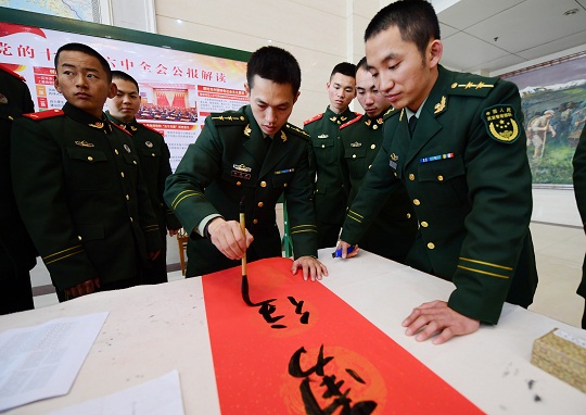 圖為武警江西總隊機動支隊書法愛好者在支隊機關為基層官兵寫春聯(lián)。曹先訓 攝